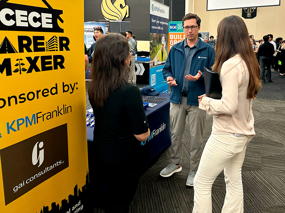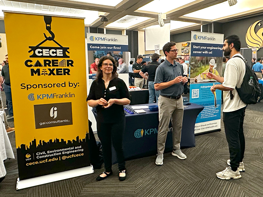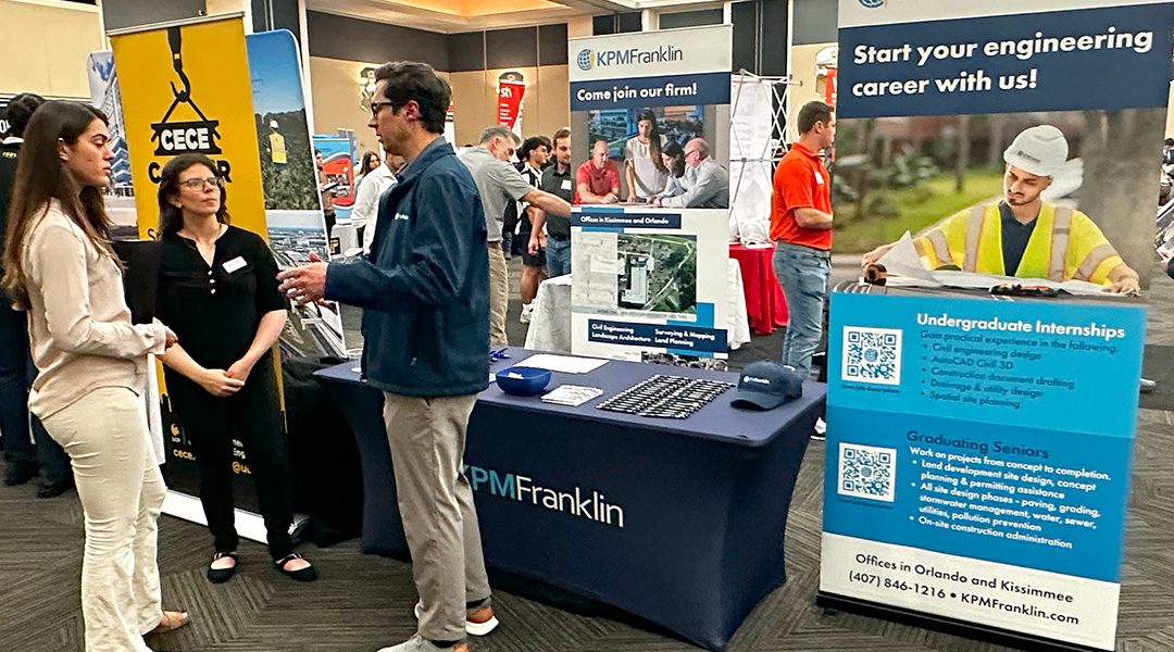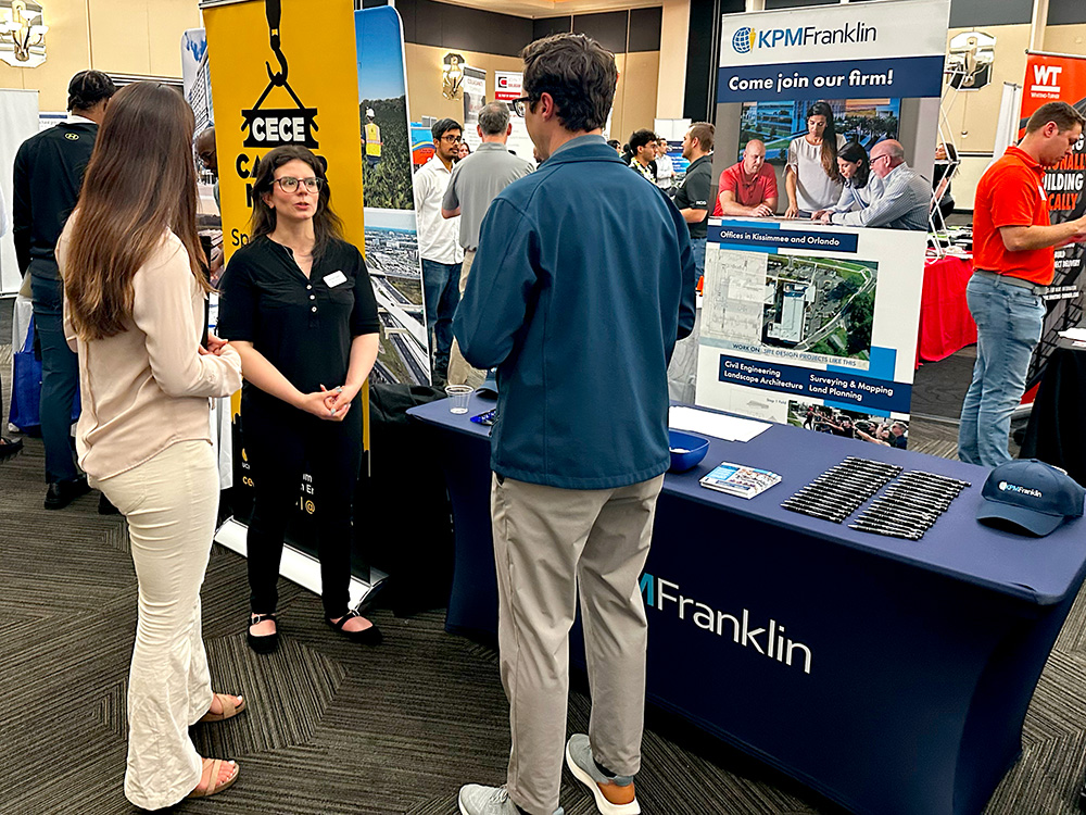 KPM Franklin’s Alex Goetz PE, vice president Orlando engineering, and Adriana Lopez EI, project engineer, connected with undergraduate students looking to jump start their civil engineering career with a part-time internship during the UCF Department of Civil, Environmental and Construction Engineering (CECE) Career Mixer in the Student Union Pegasus Grand Ballroom on the main campus.