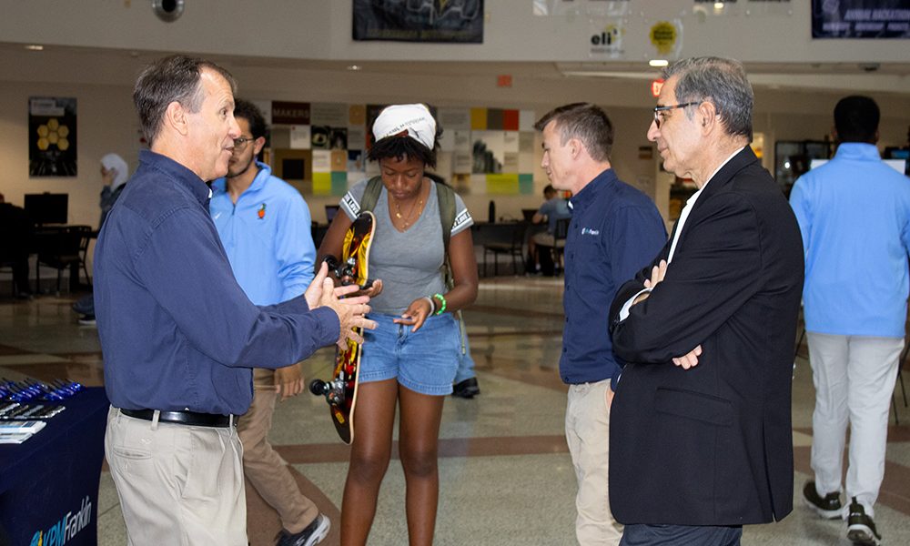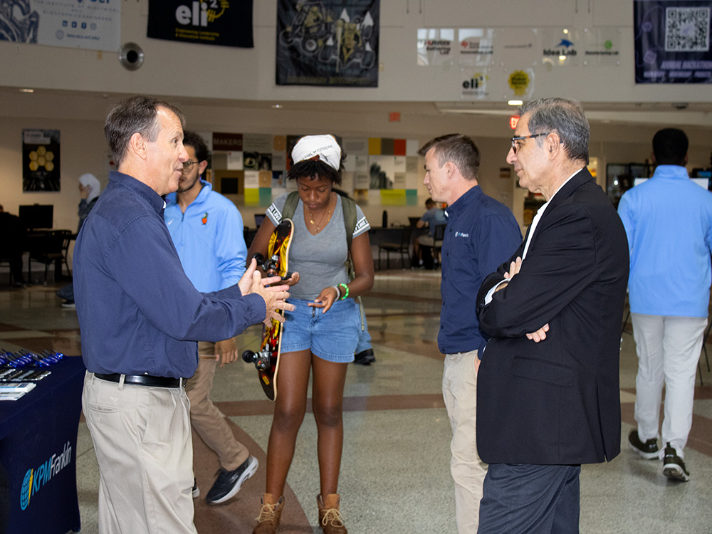 Yesterday KPM Franklin had the honor of participating in the inaugural UCF College of Engineering & Computer Science (CECS) Donuts with the Dean event in the Engineering II building atrium which provided an informal opportunity for UCF engineering students to meet and interact with Dean Michael Georgiopoulos. Greg Nixon, marketing director, and Daniel Doyle, P.E., project manager, greeted students at KPM Franklin’s table to provide more information about our civil engineering internships for undergraduates and entry-level full-time job opportunities for graduating seniors.