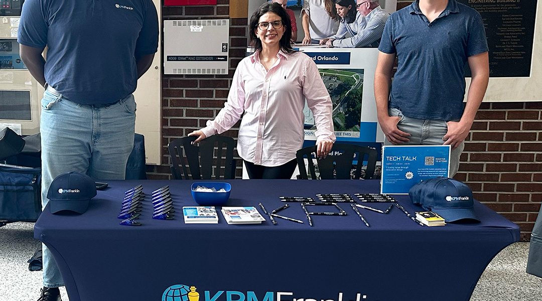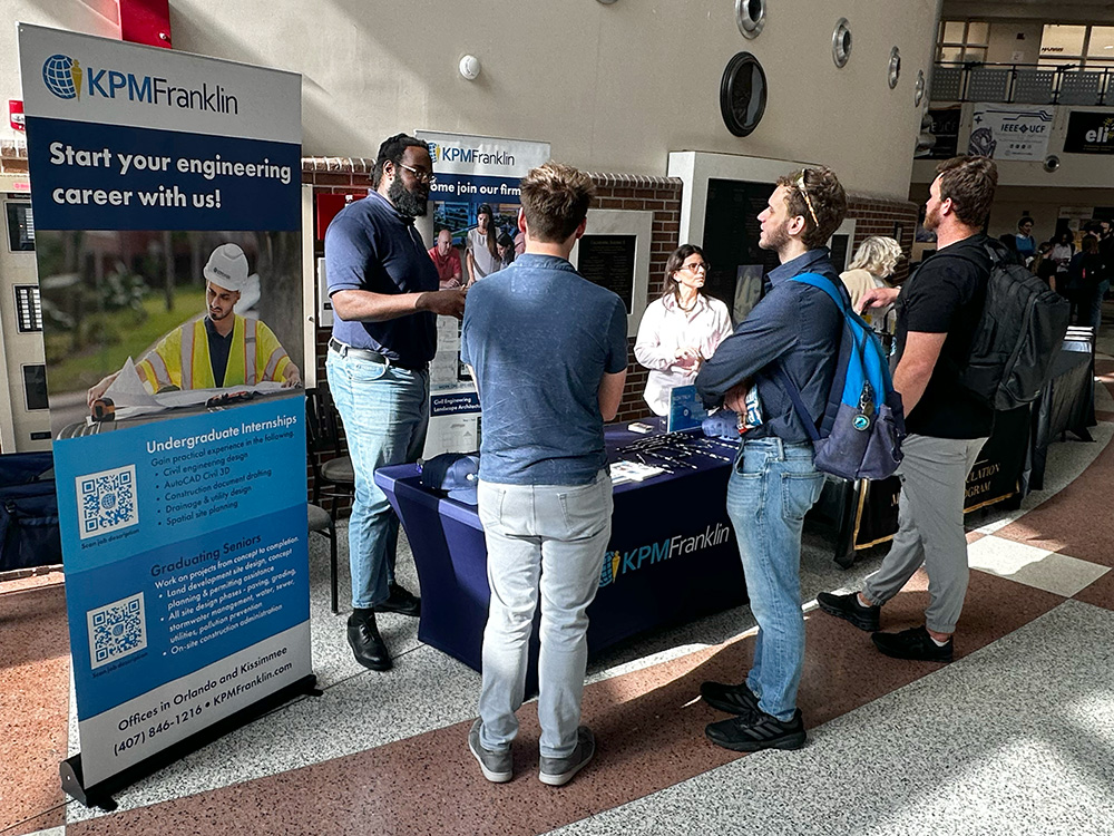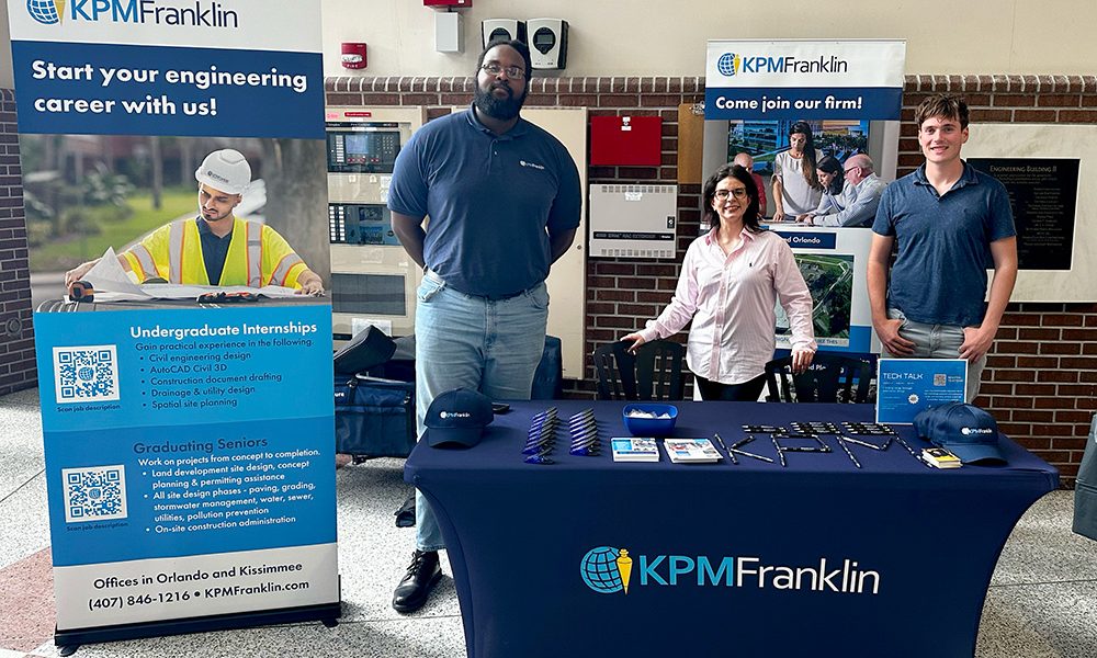 During the event, KPM Franklin’s Adriana Lopez, project engineer and UCF alumni, Vete Derisse, project engineer and UCF alumni, and Max Bravo, engineering intern and current UCF student, chatted with UCF engineering students who stopped by to say hello and ask questions about software and other qualifications and skills needed to be ready to enter the workforce.