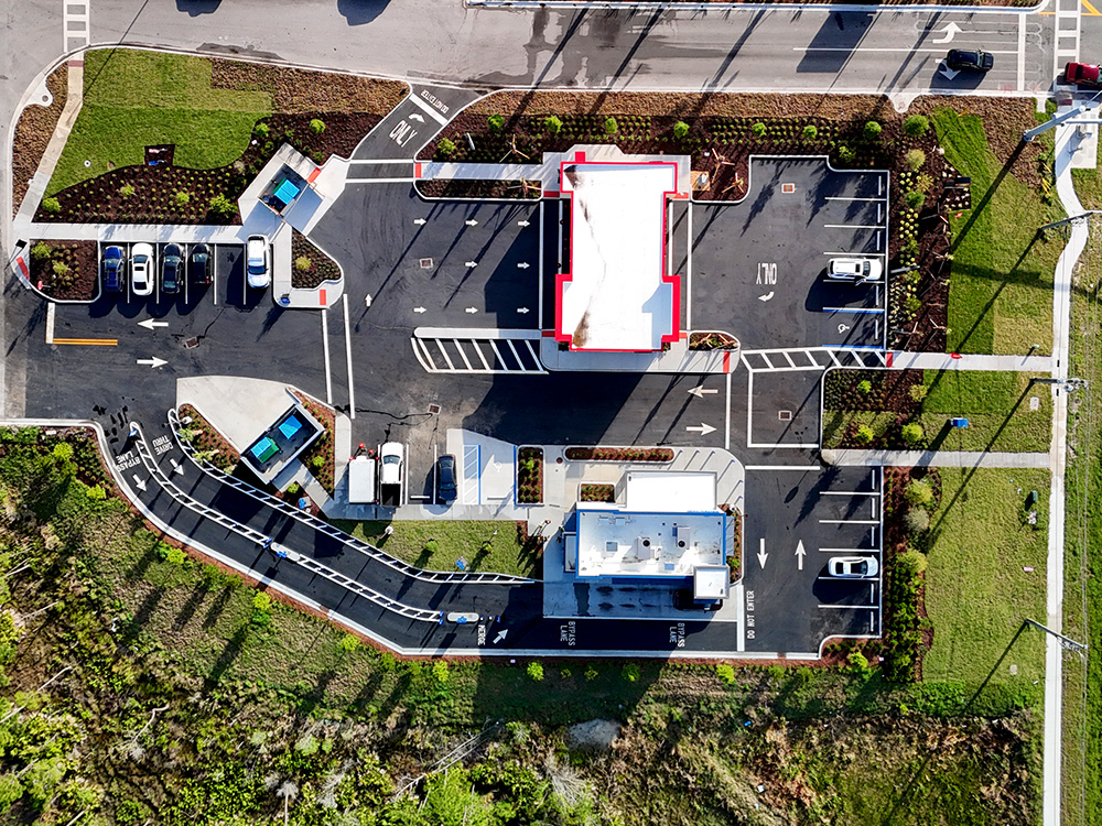Site improvements include drainage connections to an existent drainage pond, parking lot with drive aisles, dumpster pad and enclosure, two drive-thru lanes, sidewalk connections and patio space.